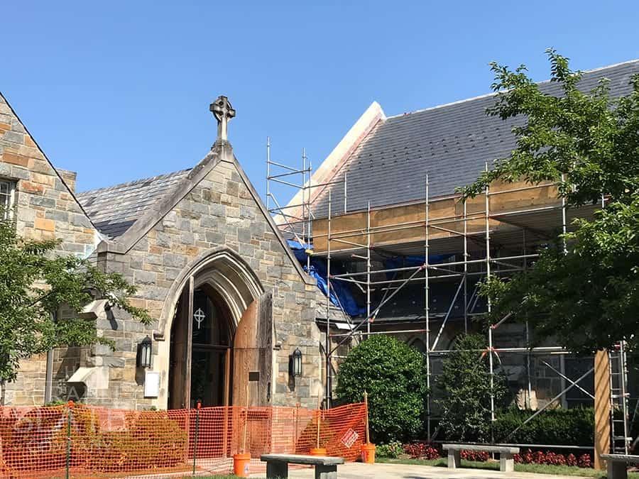 All Saints Church was built right at the turn of the century and it was a beautiful church with stone walls and a beautiful Virginia Buckingham slate roof. Well, the church expanded in 1920s, so they built a huge addition and then in the 40s, again, another huge addition. Well, these additions used the same stone, but they actually chose a lower grade black slate. They used the Pennsylvania black slate which, when it was brand new look dark just like the Buckingham. But over time as you got UV rays, as you got ice when, etc. These slates turned brown, gray, and they’re all flaking apart and when they start coming down, it becomes dangerous because this is a church as well as a school.