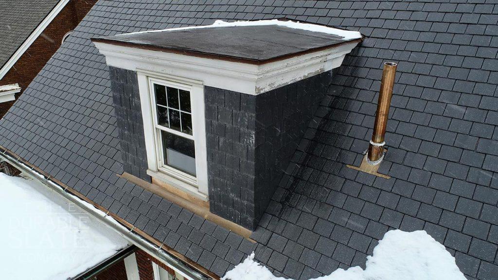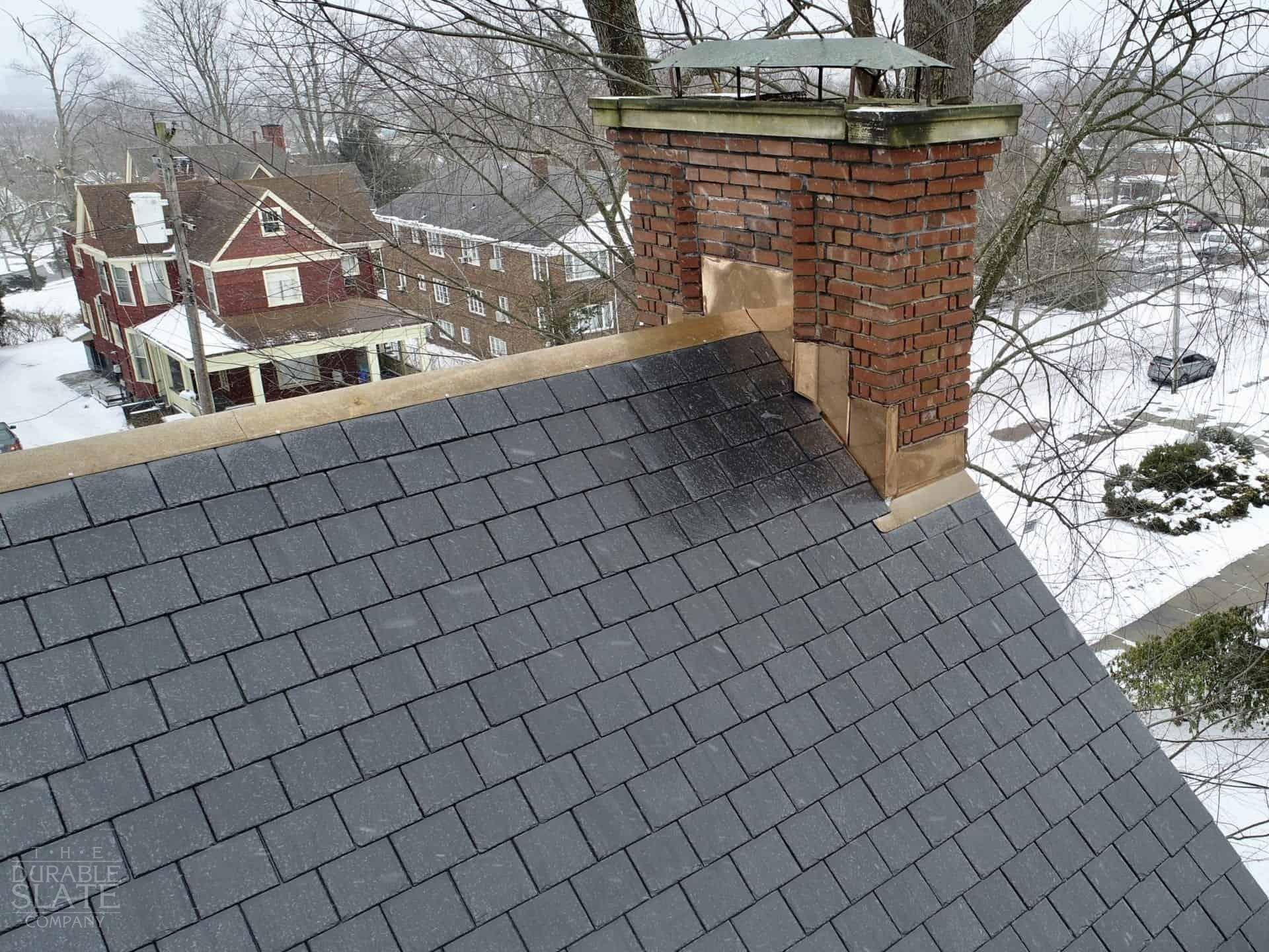 This Akron home was struck by lightning on its drive-way side. Initially, the damage appeared limited to slates and copper flashing nearest the strike point. However, because the opposite chimney was damaged, the lightning likely travelled the full length of the roof requiring that we remove the entire back-half of the roof to address the underlying damage. This comprehensive repair included new copper flashings to both chimneys, the ridge, three vent pipes, and the sides of the dormer. The original Penn Black slates were nearing the end of their life-expectancy and replaced with higher quality, albeit similar looking North Country Black. To complete the look, the slate walls on the rear upper dormer were likewise replaced.