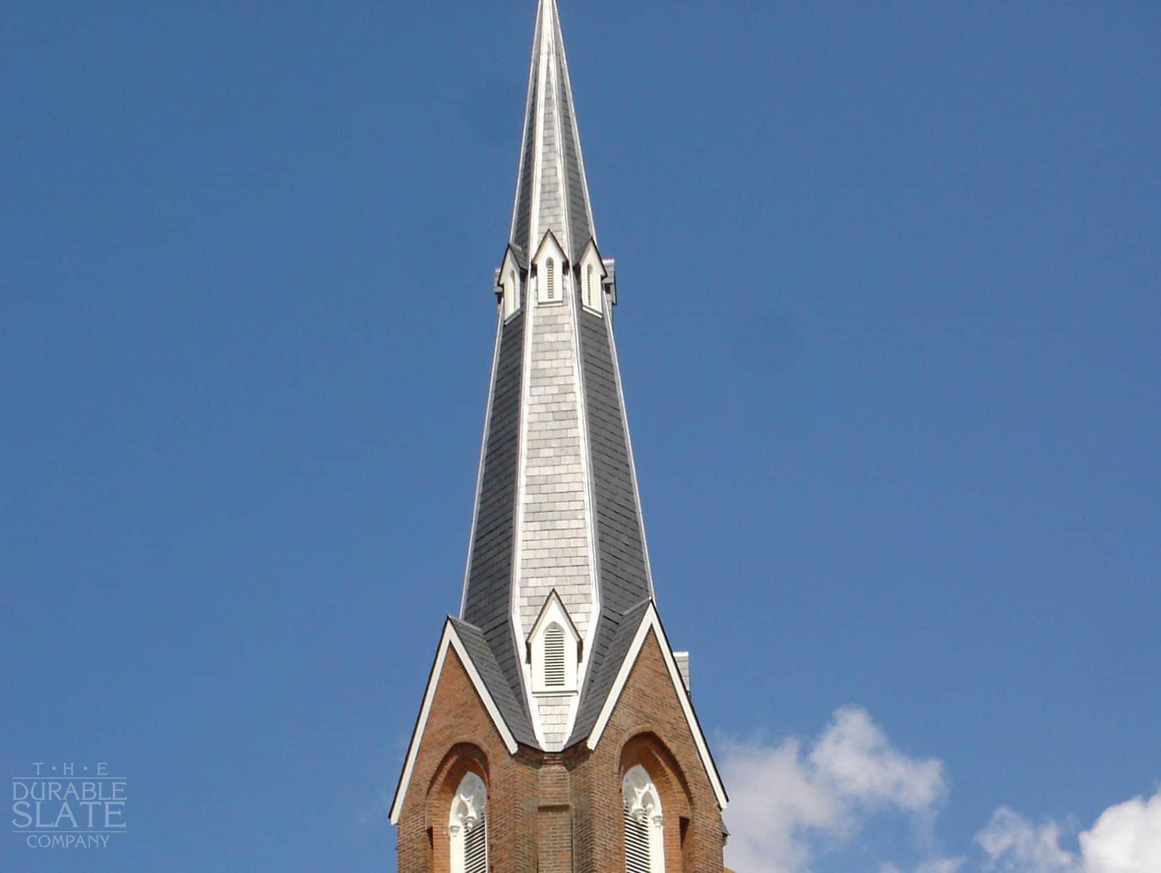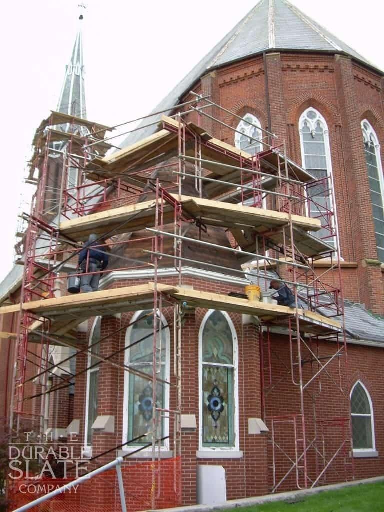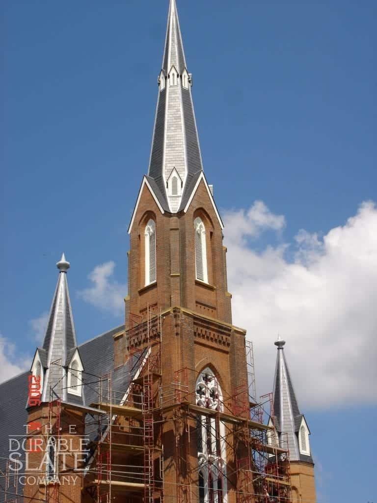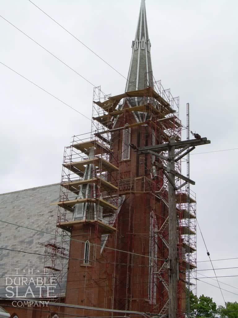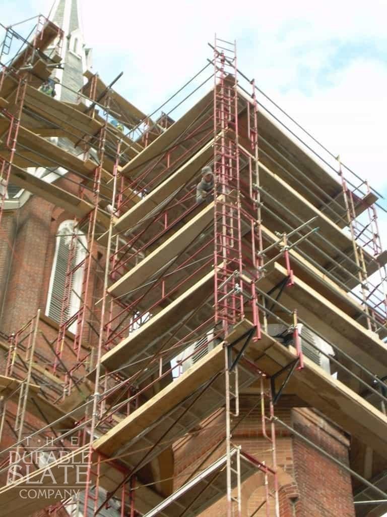 The Durable Slate Company was responsible for replacing the steeply pitched, North Country Black slate roof entirely; restoring the magnificent steeples, which included some ornamental metal work and wood replacement; concluding with new copper gutters and downspouts.