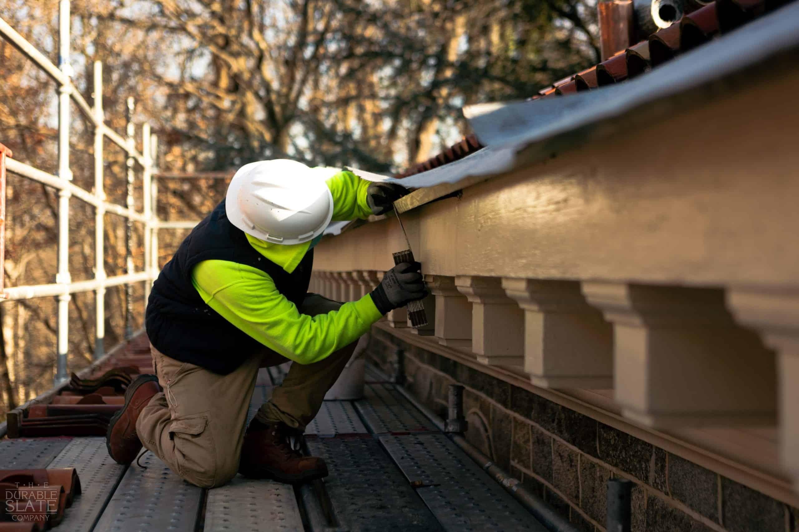 For this project, The Durable Slate Company matched and installed the original copper gutter, downspout and accessories, as well as a clay tile pick up and relay along the perimeter of the eave and on all hips and ridges, concluding with any necessary clay-tile repairs.