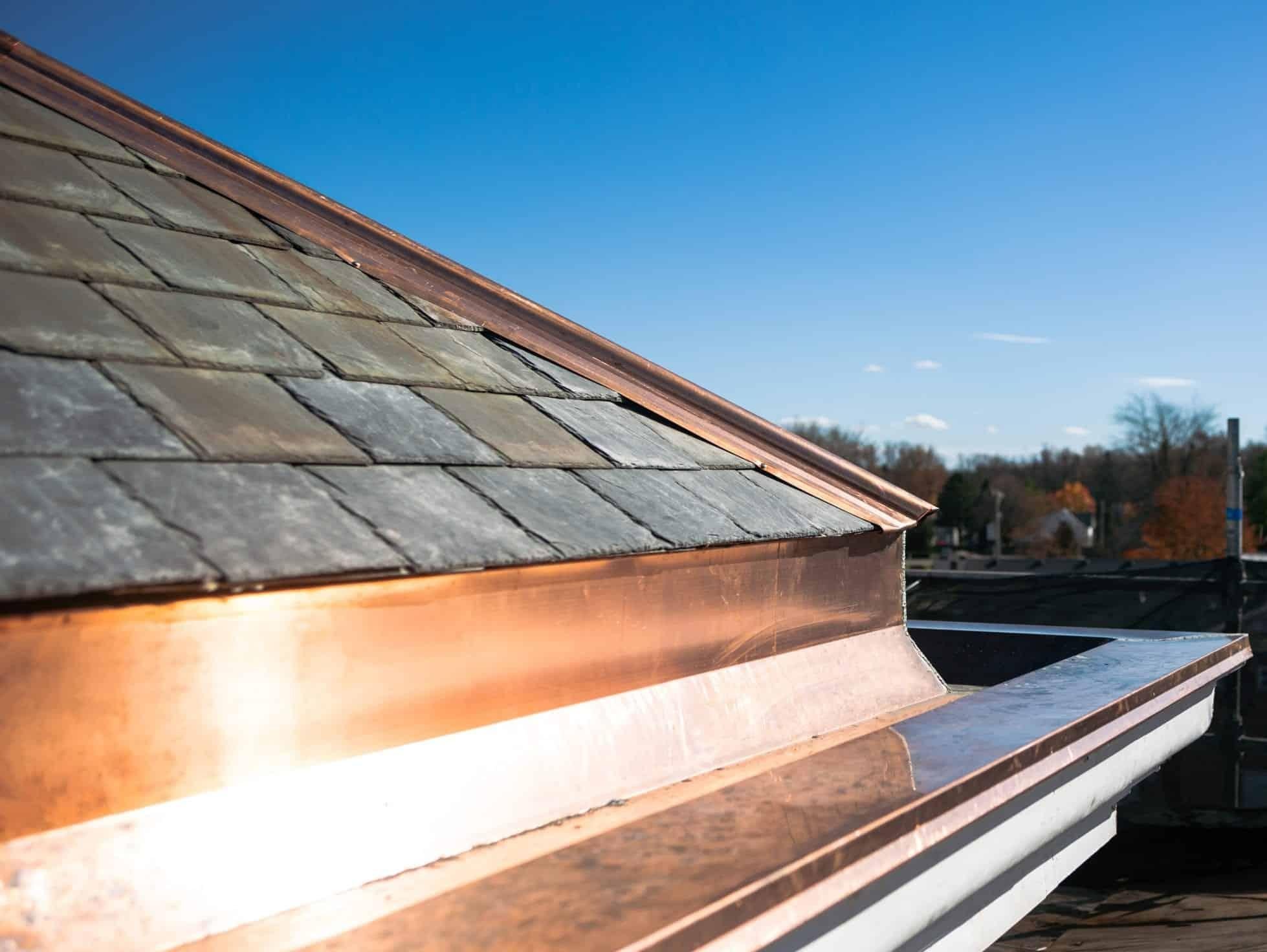 The Durable Slate Company worked on both the roof and the brick over the course of this project. We replaced many of the damaged Buckingham slates throughout the roof as well as installed new copper valleys. The chimneys were also repointed with historically accurate mortar and were reflashed with hand-soldered copper.