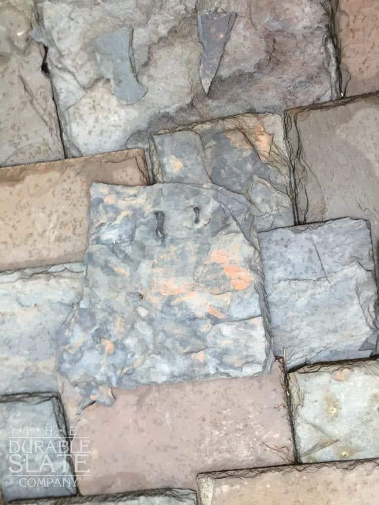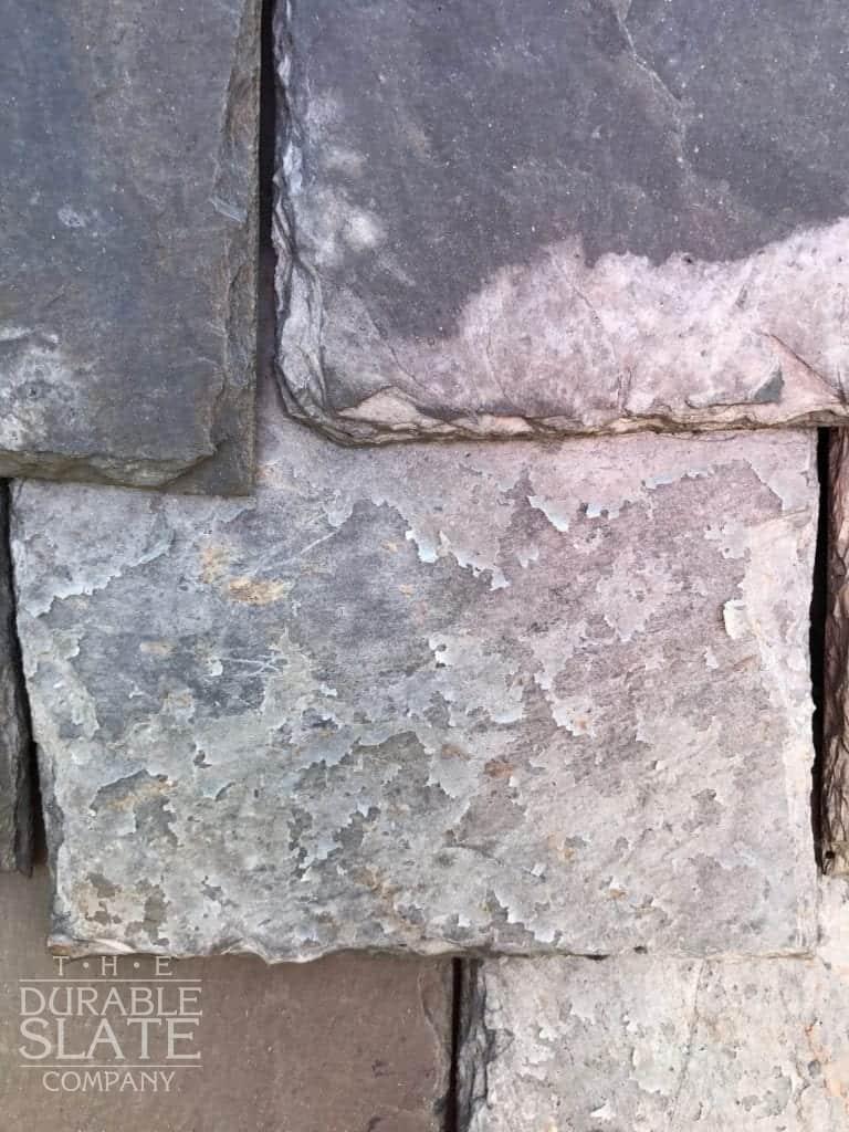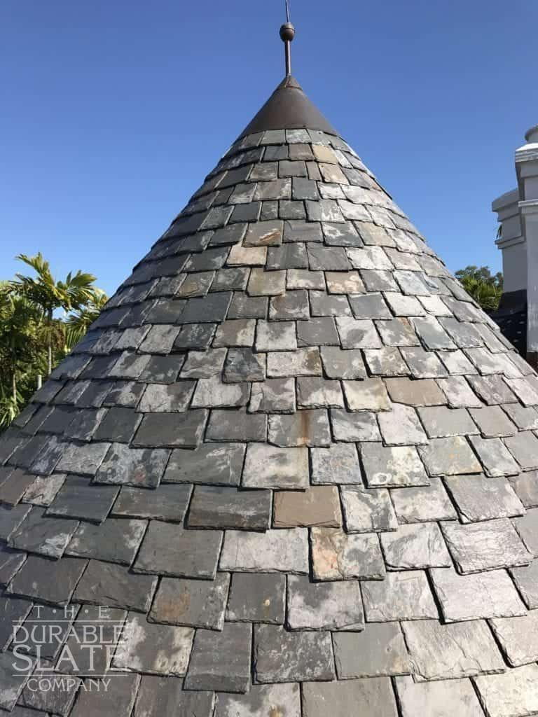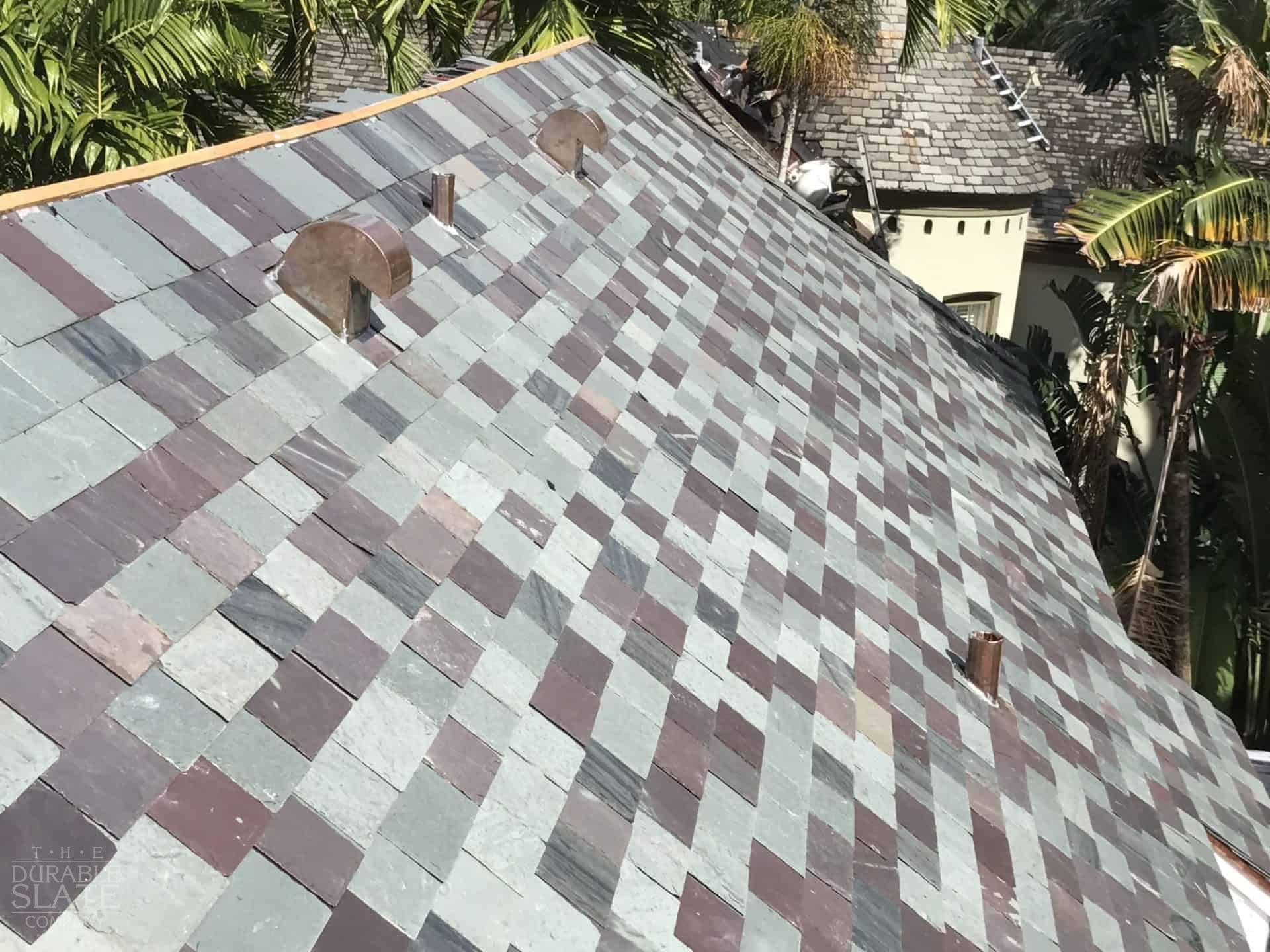 Using that picture to best match slate color and size, 16” x random sized slates were chosen with a Vermont four color blend, composed of 40% Variegated Purple, 35% Semi-Weathering Green, 15% Unfading Green, and 10% Strata Gray. After the slates arrived at Coral Gables, they were shuffled to make sure that no uniform patches of color or size could be accidentally installed.