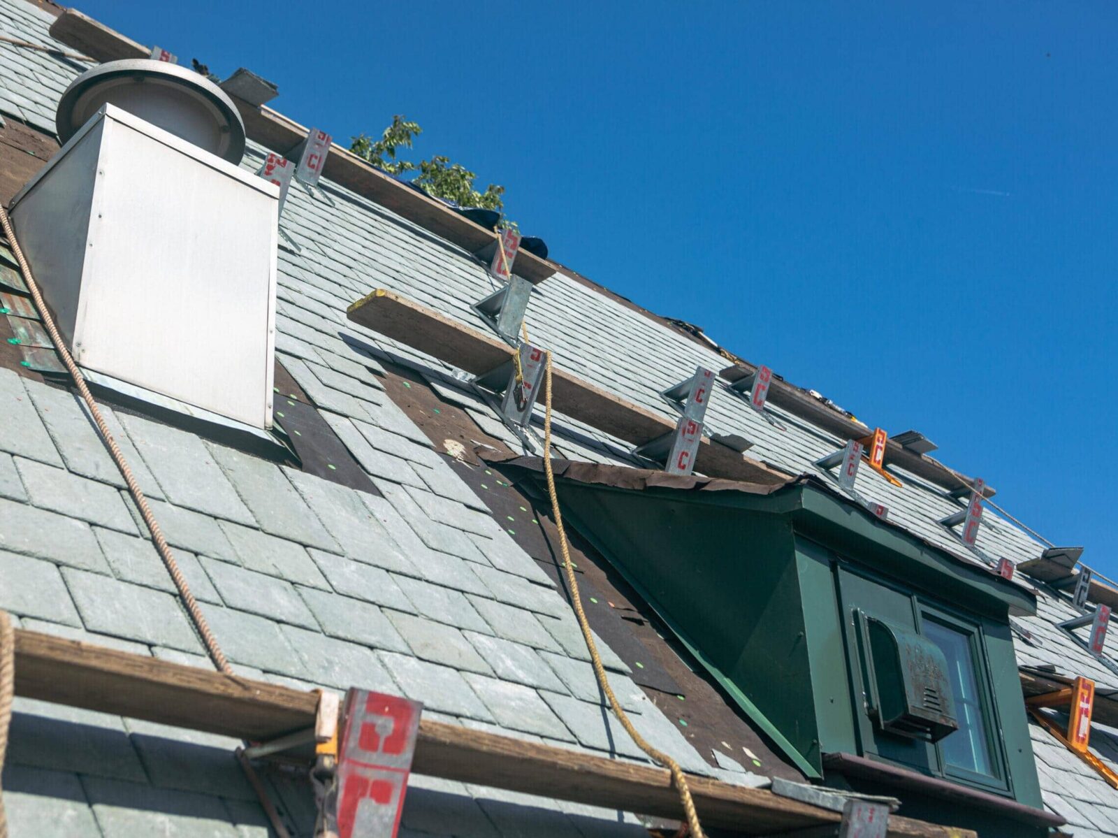 Tri Delta's roof was partially covered with tile roofing material, while other areas were roofed with Vermont Unfading Green slate. It was decided to have the entire roof protected by Vermont Unfading Green slate. As such, our scope of work was removing the existing tile and installing new slate where needed. Additionally, the existing flashings were reflashed with new Freedom Gray.