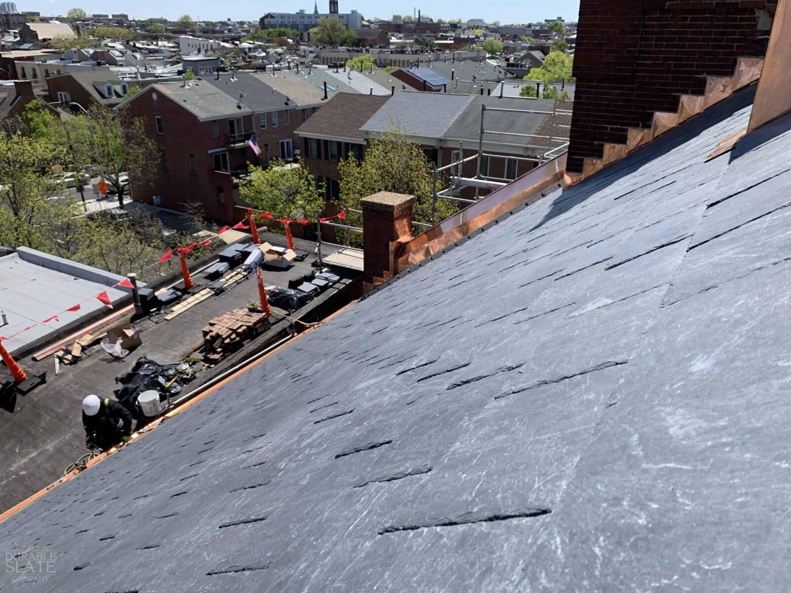 In association with Encore Sustainable Architects, our crews were able to remove the deteriorated Peach Bottom slate and copper flashing down to the bare decking. Because Peach Bottom is no longer quarried, Spanish slate was installed as a budget friendly alternative. Ice and Water shield was then installed throughout the roof, as well as copper flashing along the wall and apron of the tower.