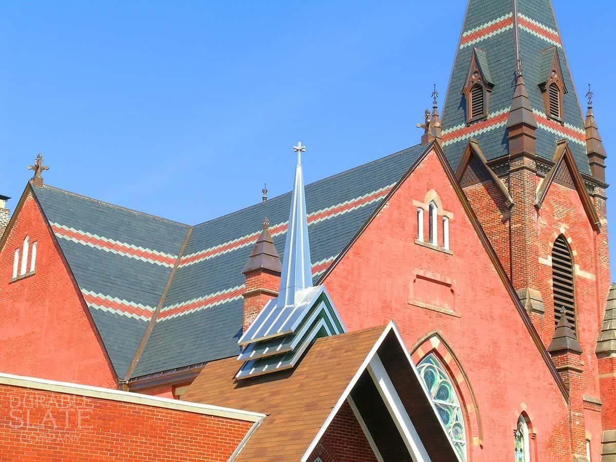 For this project, the structural elements of the steeple were stabilized before work began. The original decorative metal work was badly deteriorated. Original pieces were precisely duplicated in new copper. As the metal work was completed, the steeple was slated with new black, green, and red slate. Asphalt shingles were removed from the main church roof, which was slated with the same pattern as the steeple.