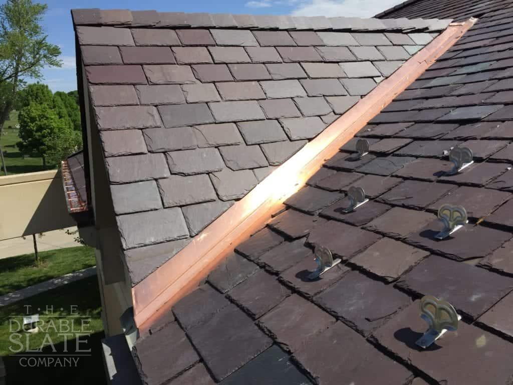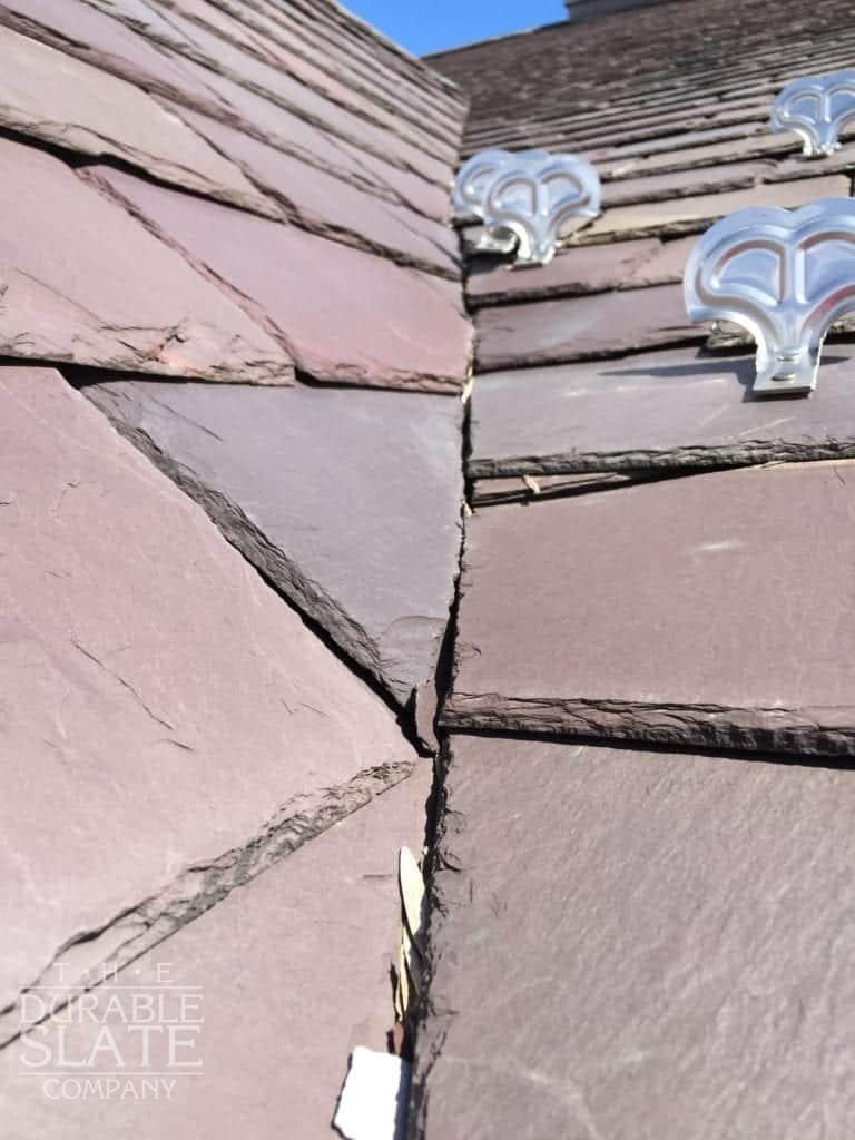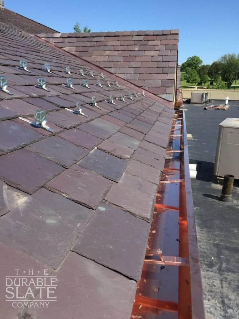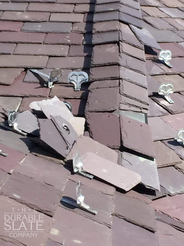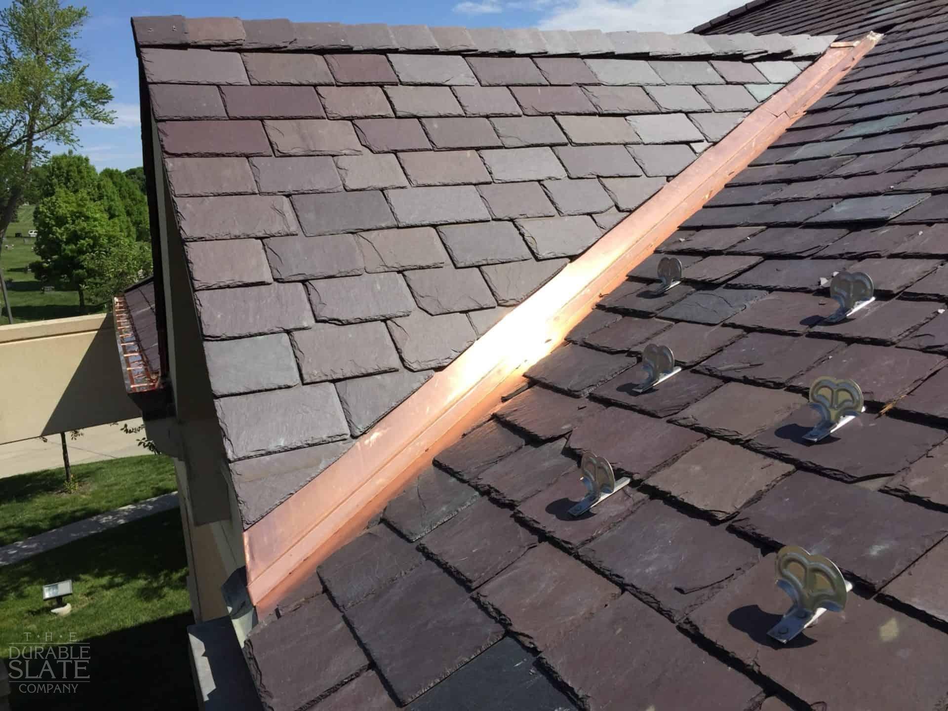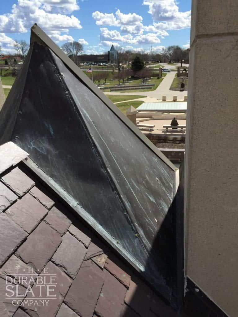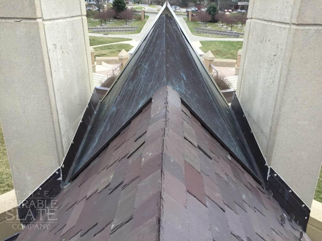 A roof inspection revealed that this Omaha church's Mottled Green and Purple slate had not been installed correctly; the slates had been nailed and overlapped incorrectly. In addition, two of the roof valleys - areas where sections of roof meet - were "closed", indicating that no metal was showing. Because each roof had a different pitch, water cascading down the steeper slope had a chance of slipping behind the valley of the opposite roof, creating a leak. Thankfully, the heavy underlayment caught any infiltrating water and prevented interior damage.