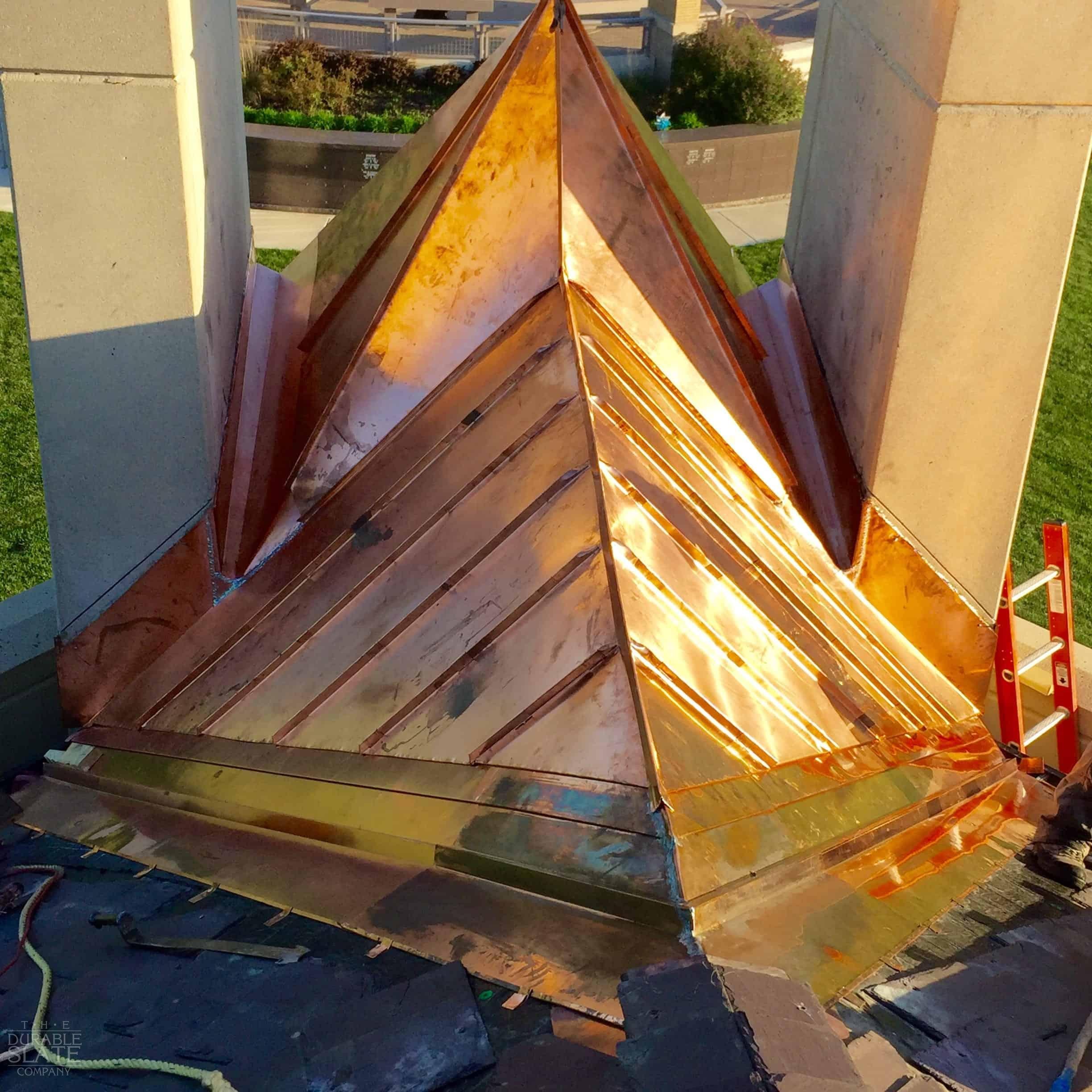 To resolve these issues, The Durable Slate Company replaced hundreds of slates across the roof and installed new copper valleys, as well as magnificent new standing seams roofs and flashings.