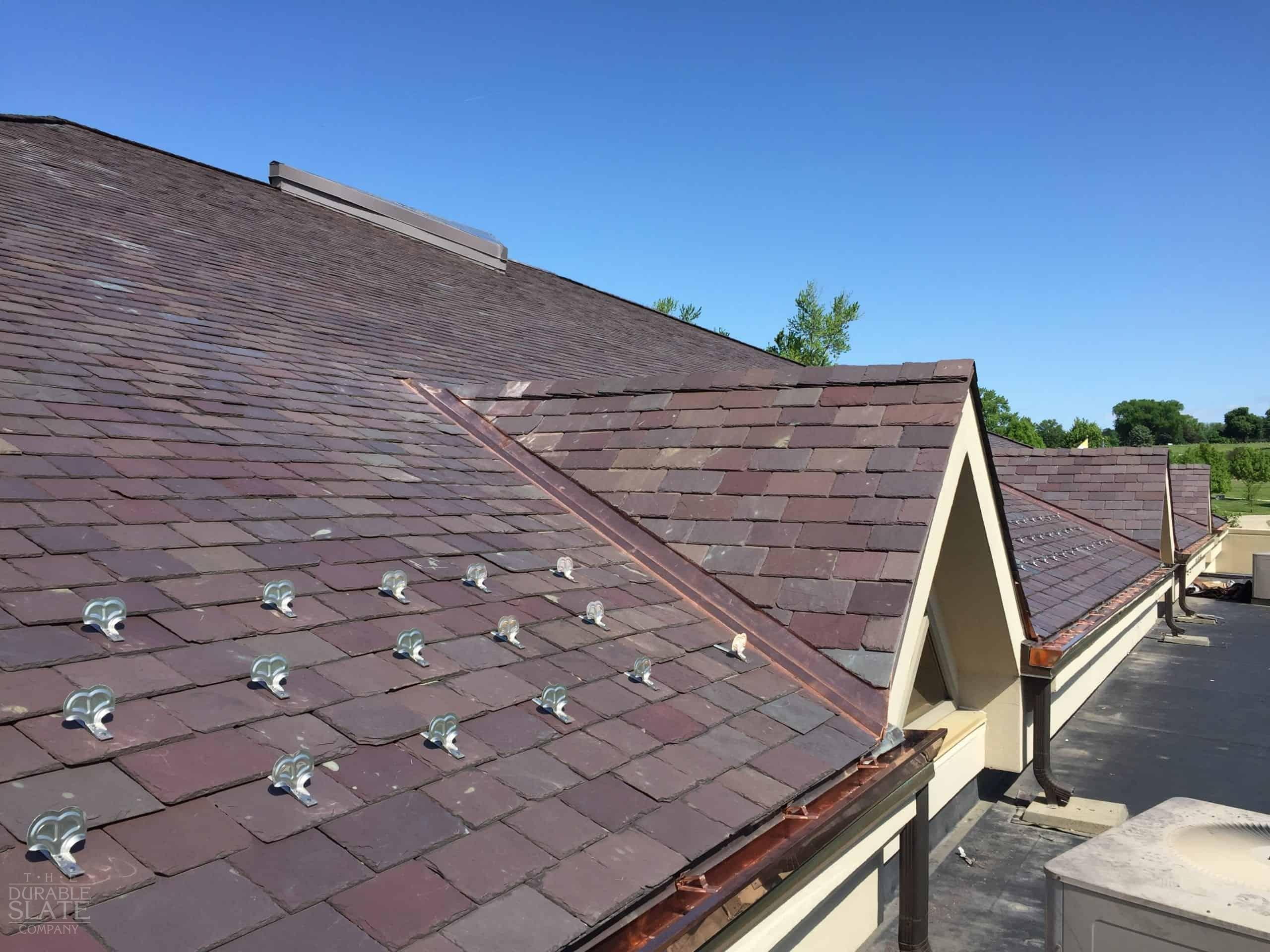 A roof inspection revealed that this Omaha church's Mottled Green and Purple slate had not been installed correctly; the slates had been nailed and overlapped incorrectly. In addition, two of the roof valleys - areas where sections of roof meet - were "closed", indicating that no metal was showing. Because each roof had a different pitch, water cascading down the steeper slope had a chance of slipping behind the valley of the opposite roof, creating a leak. Thankfully, the heavy underlayment caught any infiltrating water and prevented interior damage.