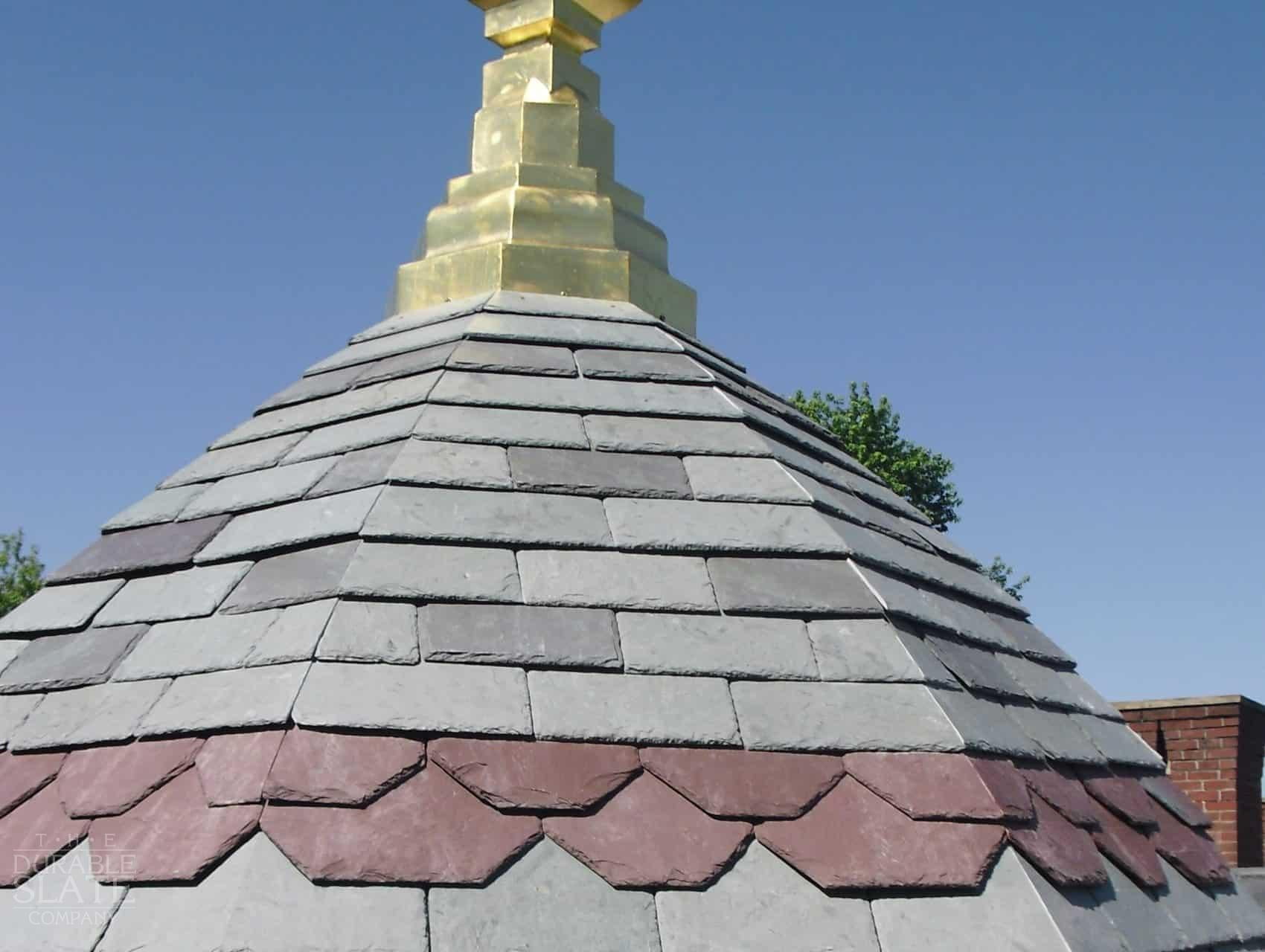 We restored the slate dome, and installed salvaged Vermont Mottled Green and Purple on the dome using a custom cut design with multiple colored slates to create a beautiful patterned roof. We also replicated an old steel finial the was all hand soldered. At the customer’s request, we then gold leafed the finial before installing it on top of the slate dome.