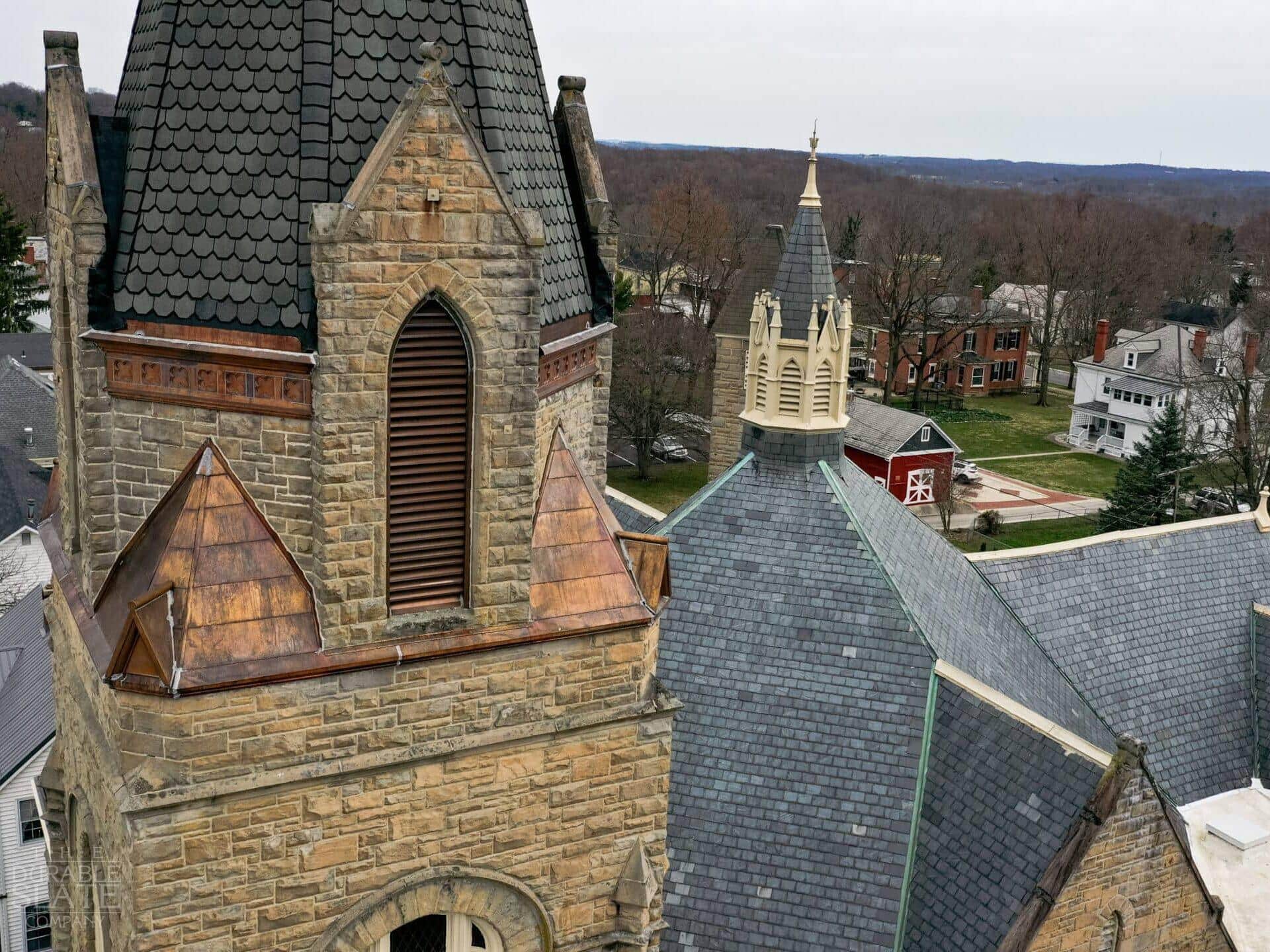 For the Presbyterian Church of Hillsboro, Ohio, we removed all of the loose and damaged cornice-decorative dormer metal. Once the site had been cleaned, our carpenters re-framed and re-decked as needed to install the new decorative metal work. And finally, we fabricated and installed the new decorative cornice and four corner dormer roofs in new copper and re-framed and cladded all four louvers in copper.