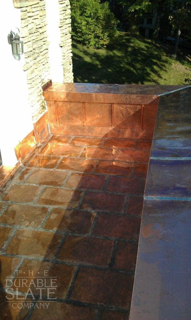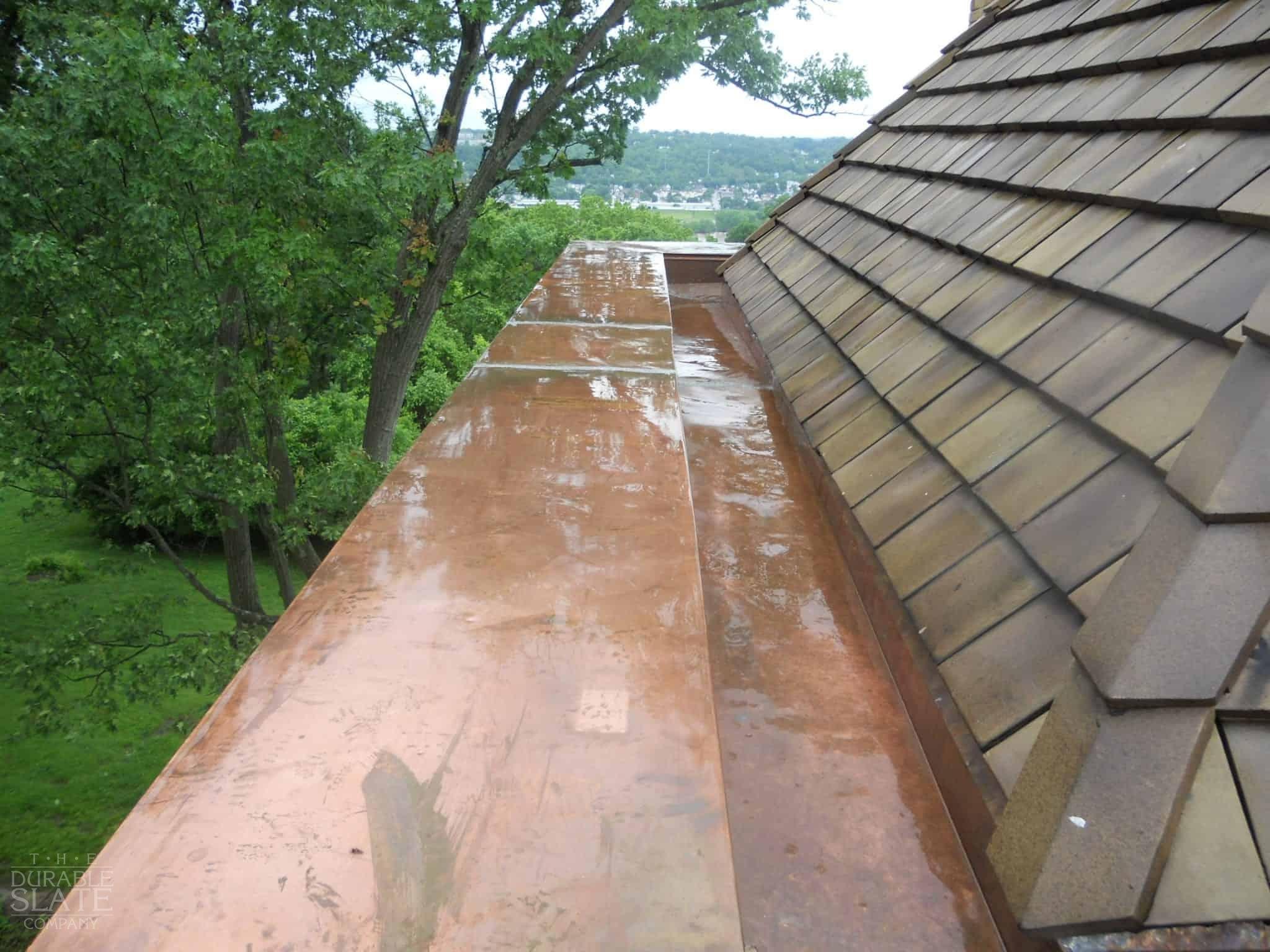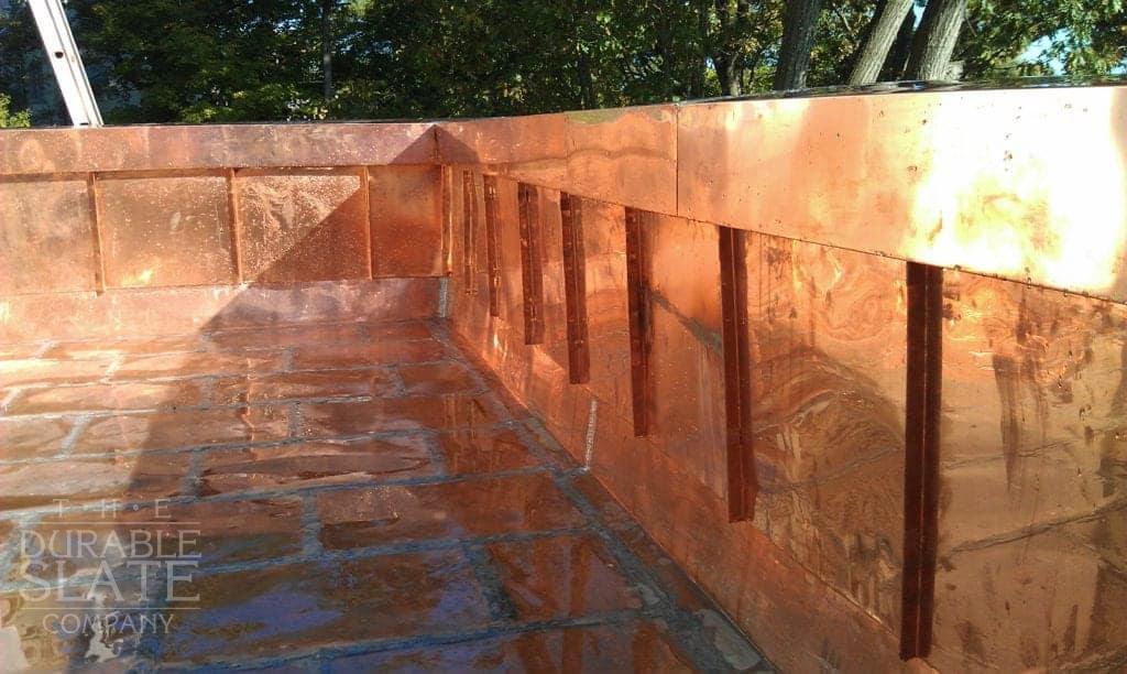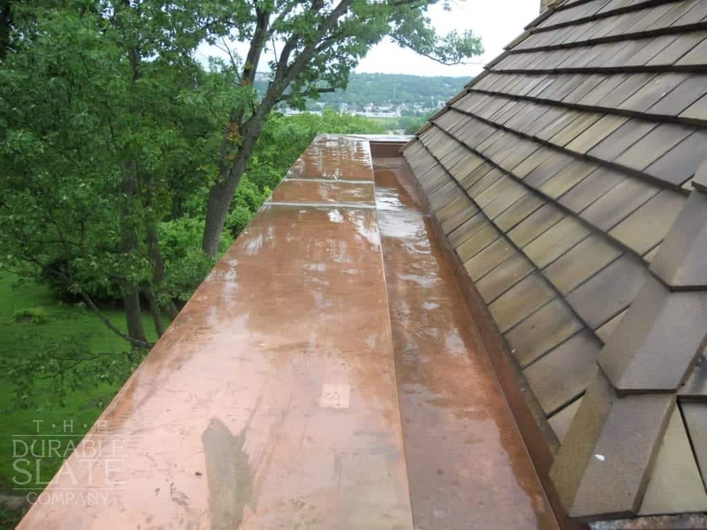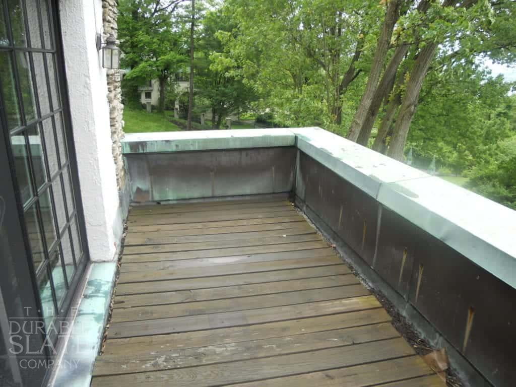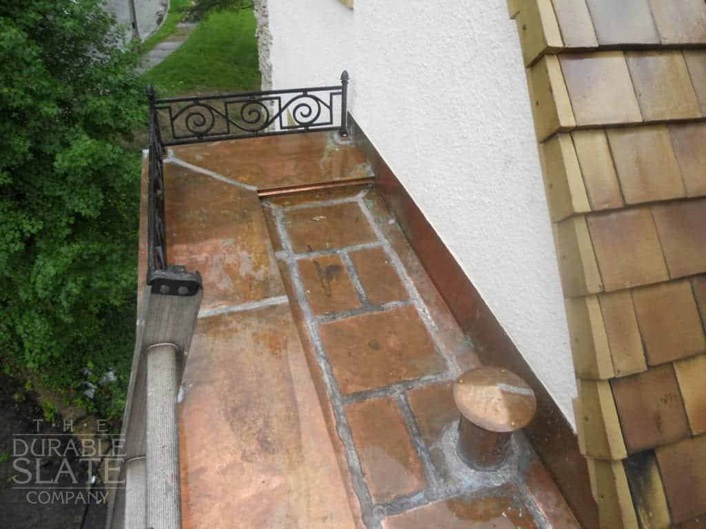 For the lower balcony roof, The Durable Slate Company installed 16 oz flat-lock copper flooring, standing seam panels (added to the parapet walls), and parapet caps.
