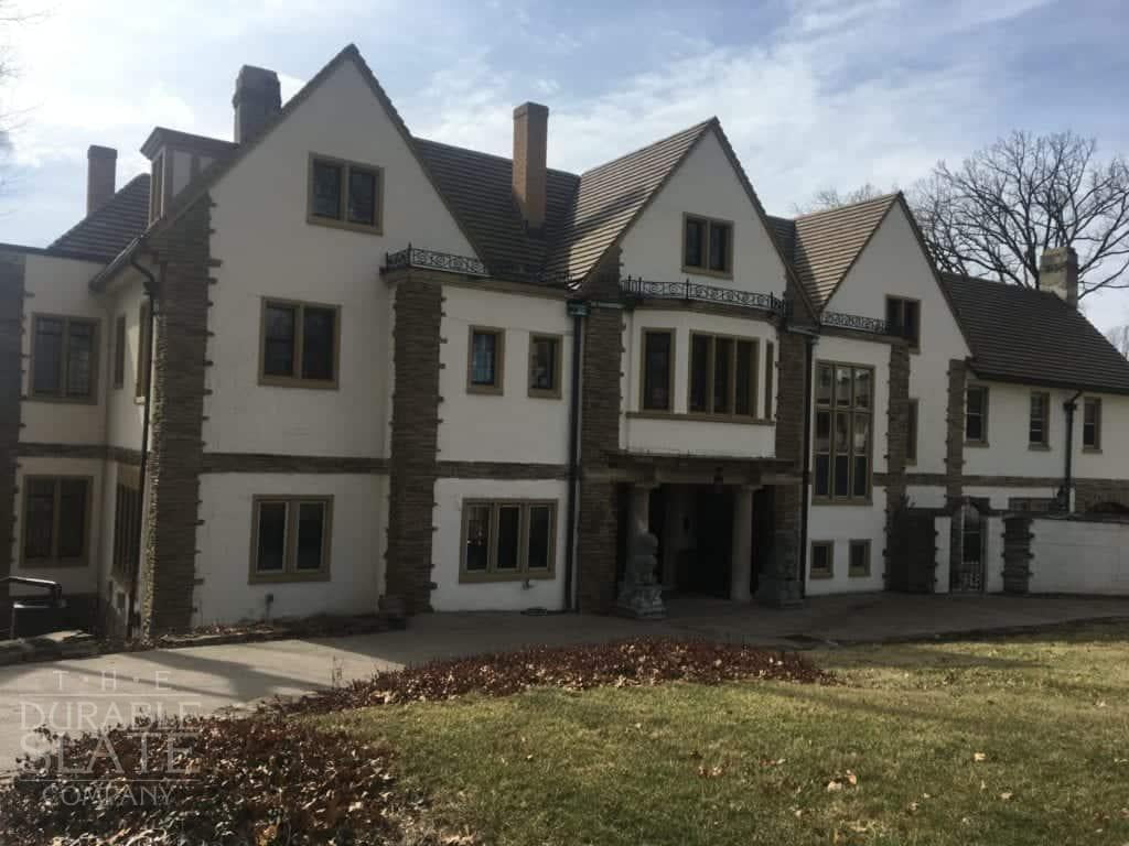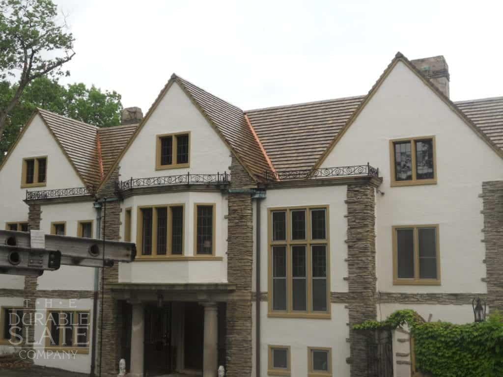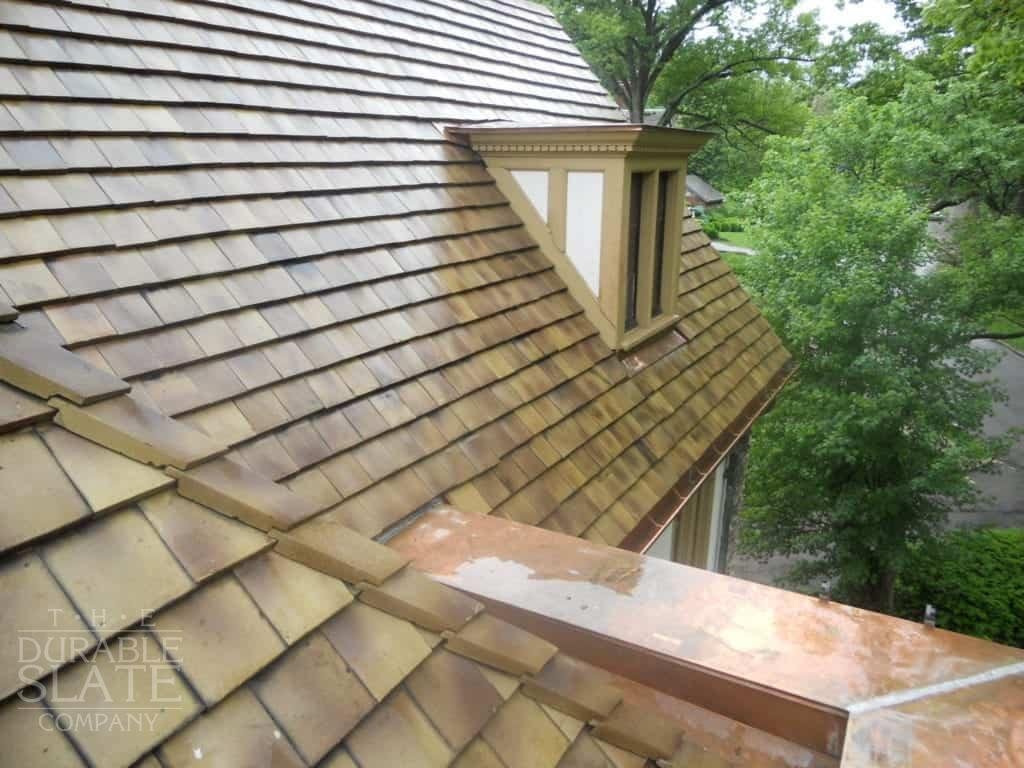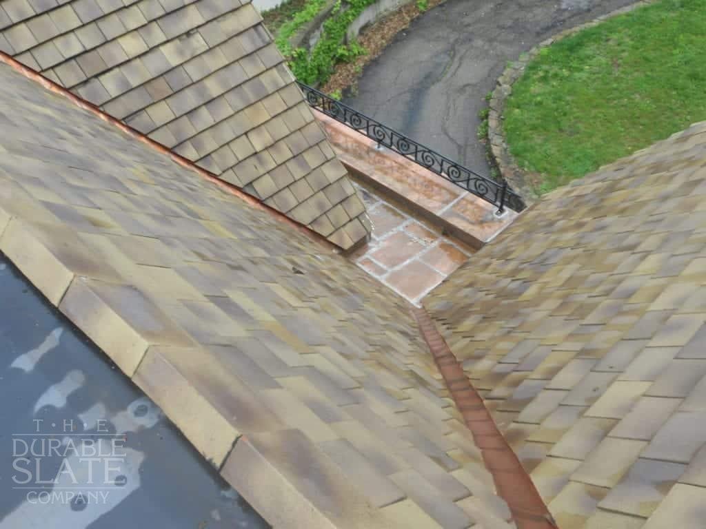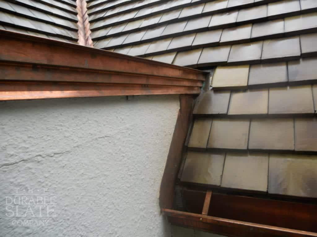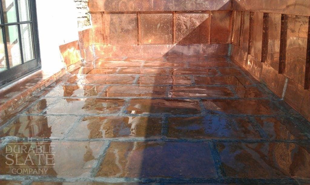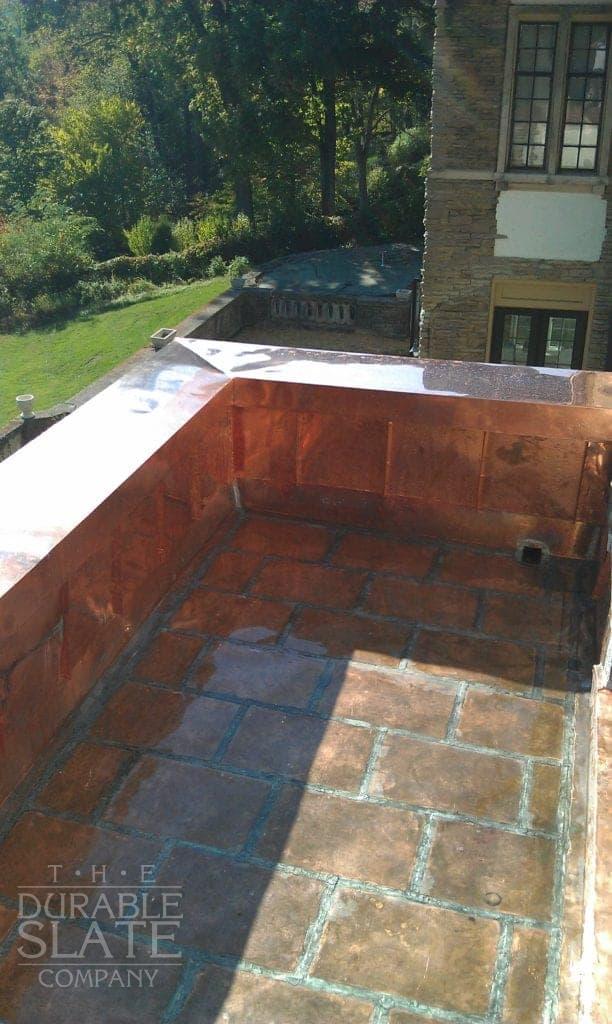 For the lower balcony roof, The Durable Slate Company installed 16 oz flat-lock copper flooring, standing seam panels (added to the parapet walls), and parapet caps.