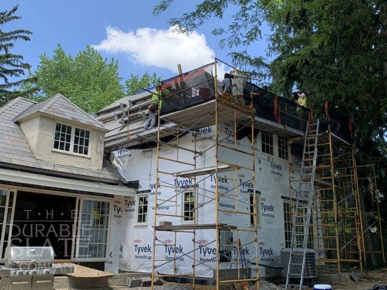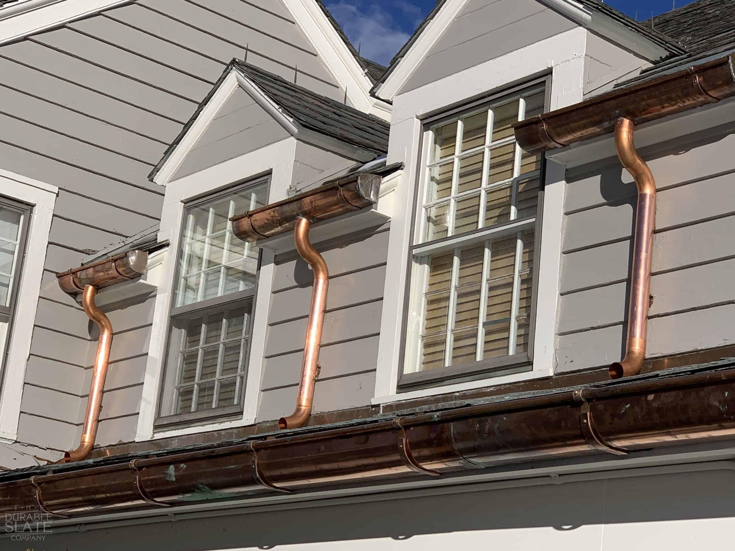 Impressively, it was built to withstand a full-scale military attack. With 17 incoming telephone junction boxes (obsolete now, but big at the time), it was designed to act as a reliable communication hub as well. And while the building might withstand a missile strike, it was an uncommonly brutal hail-storm that damaged its copper gutters and slate roof. But slate is durable stuff and the roof was simply repaired. The gutters and downspouts, however, fared worse and were replaced with 20 ounce custom copper gutters with a high-back or a flange. These gutters are installed on top of the roof to prevent any leaks resulting from ice damming. To do this, the bottom three rows of slate were removed, gutters and new Ice and Water shield were installed, and the slates reinstalled.