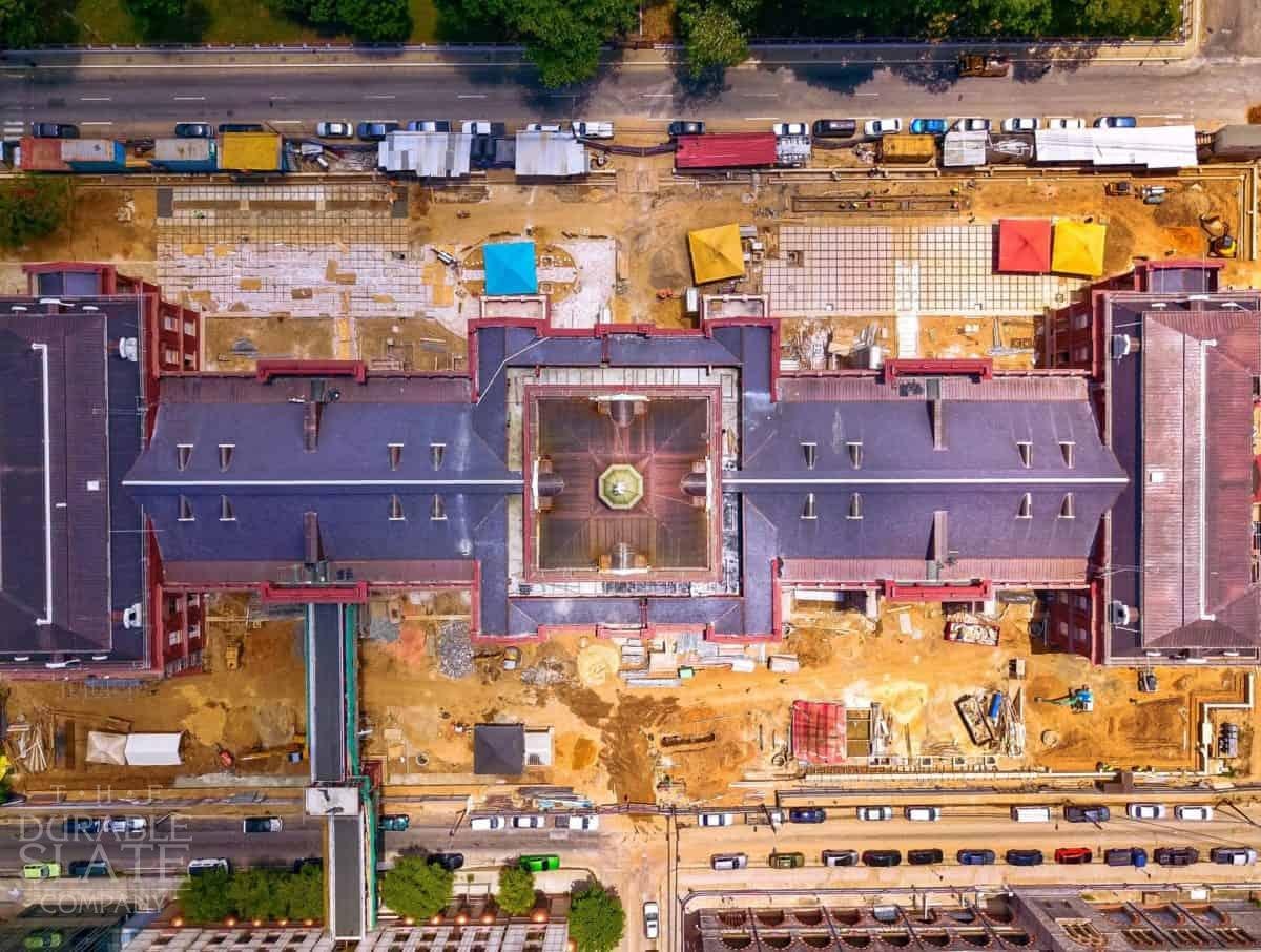 It's about 350 squares of Welsh Penrhyn Purple slate, about 300 squares of copper standing seam, about 2000' of copper box gutters, and nearly 20 squares of curved batten seam copper on the rotunda. We met with them and gave them new specs, brought in all the proper equipment and tools necessary to do the job, and trained their people on the install, while we did all the difficult details.