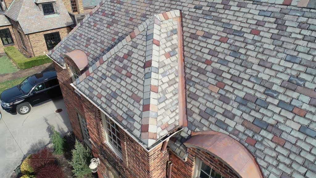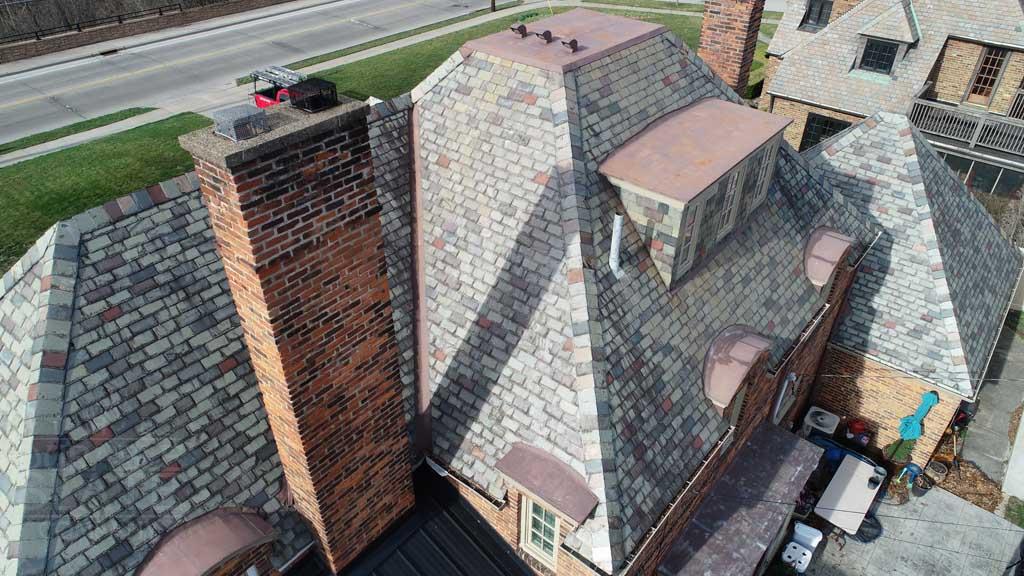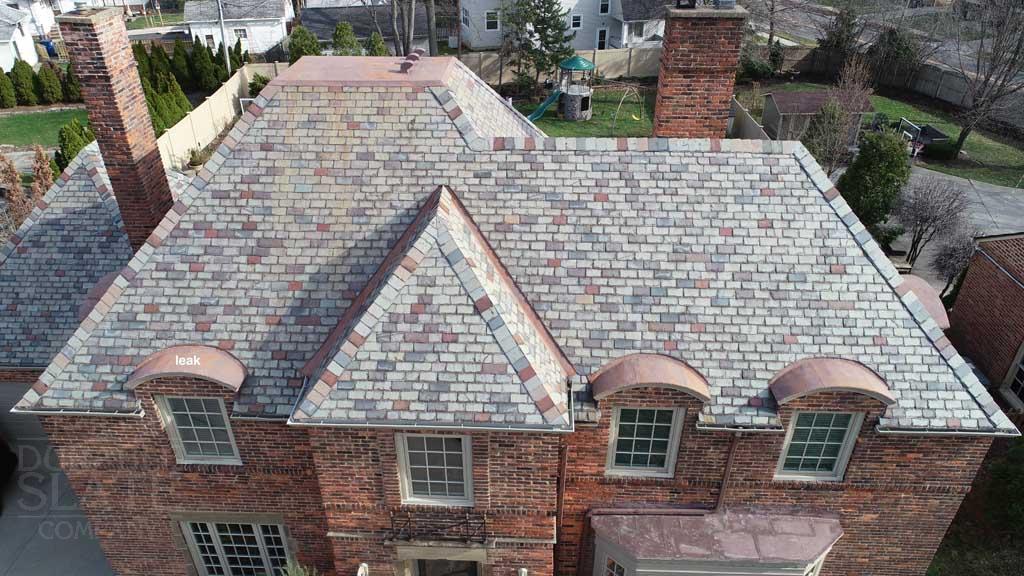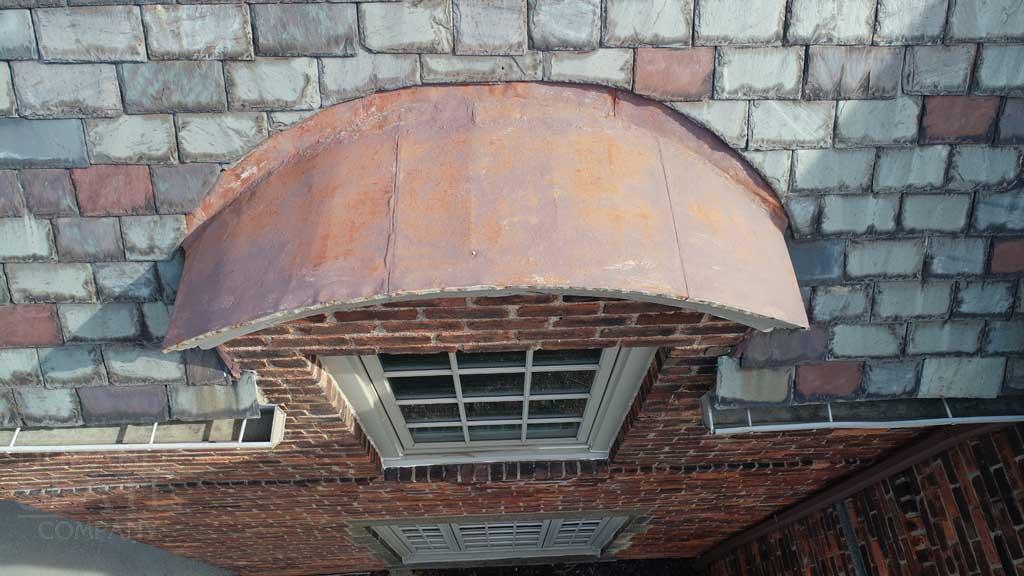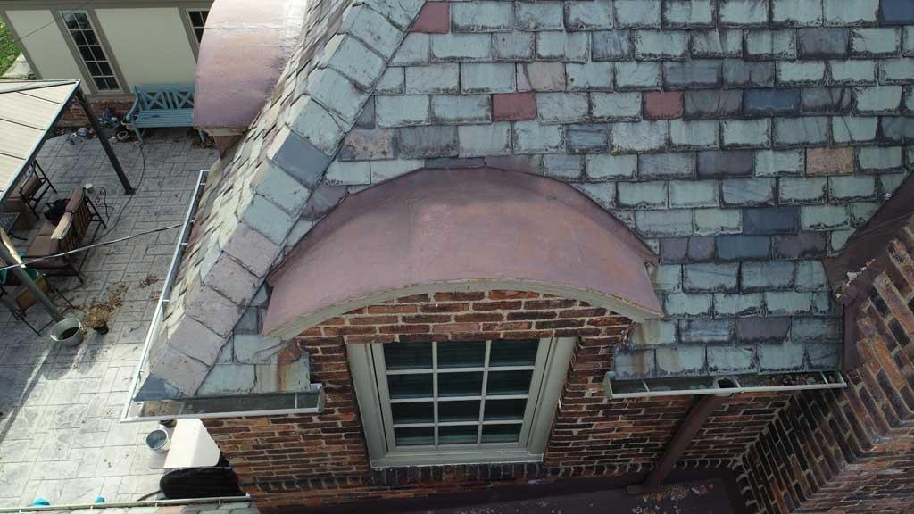 This private residence previously had steel roofing that had rusted over. With this, The Durable Slate Company removed the rusted bay roof, dormer roofs, chimney, and valley flashings and replaced them all with new copper.