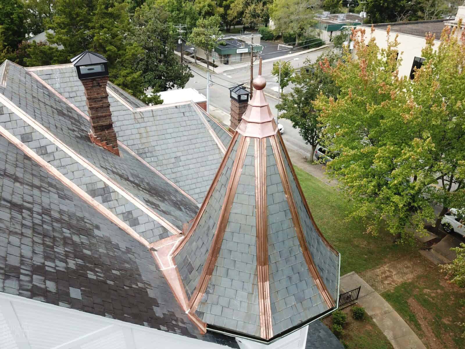 After inspection of this historic property, the chimney flashings and valleys seemed to be past their service life. They had been reworked and patched with roof cement which expands when hot and shrinks when cold. The change in temperature caused leaks in the winter, but it ‘repaired’ itself in the summer when the cement expanded back. The Galvanized steel ridges had also been past their service life. The flashings, valleys, and ridges were all replaced with copper.