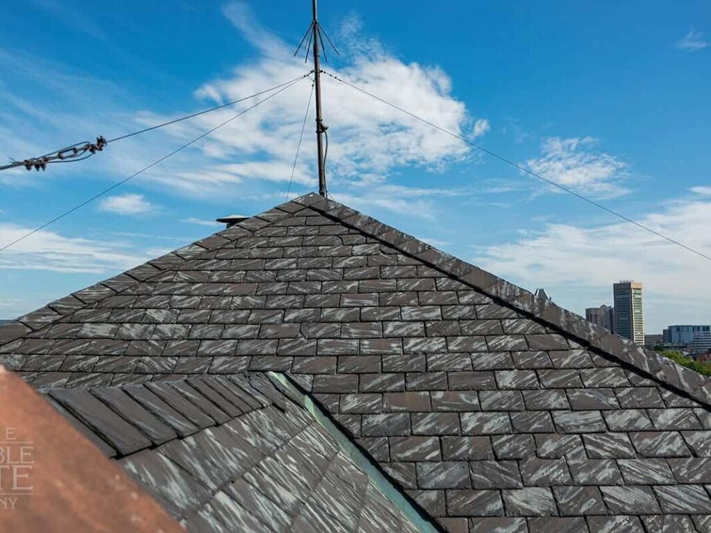 Working alongside Azola Building Rehab Inc, The Durable Slate Company replaced Chapman slates and crooked hip slates, spread throughout the roof. In addition, we sealed all ridges and hips with roof cement, caulked any penetrations, and protected two vent tops with rust inhibiting paint.