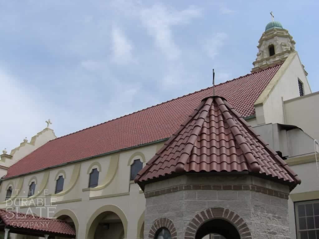 Understandably, the church didn't want to replace their beautiful roof, but they also didn't want a hodge-podge of tiles that didn't fit or weren't exactly the same red color. We sourced reclaimed Ludowici tiles that matched the exact size, color and profile. Once the repairs were done, seamlessly, it looked original.