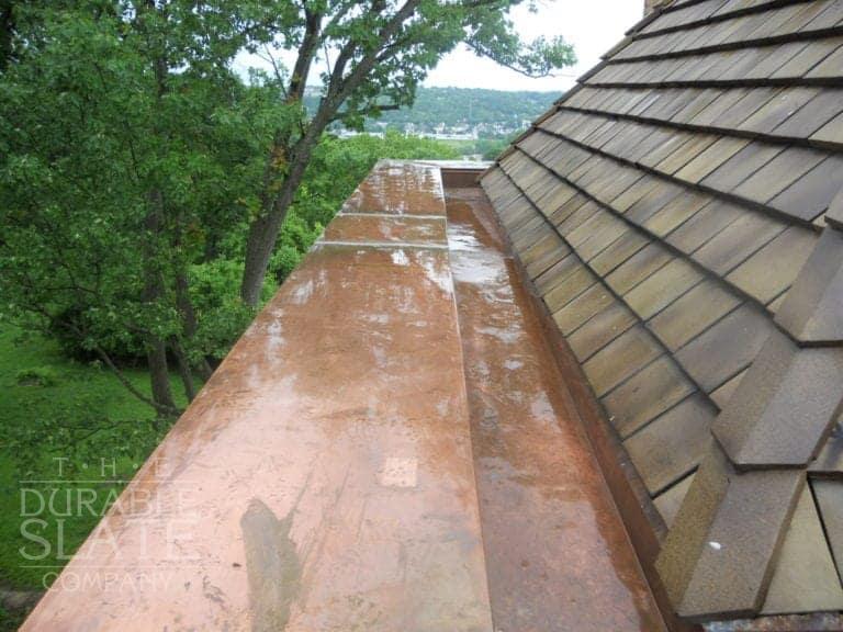 To begin, we removed the entire main south face and lower south face of the roof, distributing these tiles for repairs elsewhere. The reclaimed tiles were used to re-roof the now exposed southside, in addition to new underlayment, copper flashings, and copper gutters. All told, the result is a stunning and seamless repair.