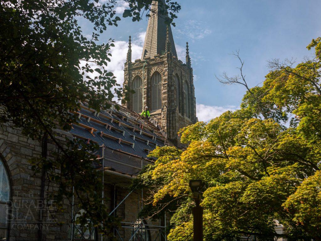 For this historic church, The Durable Slate Company took off the existing Pennsylvania black slate roof, which was near the end of its service life. The roof will be replaced with new North Country black slate which has a life expectancy of 100 years or more.