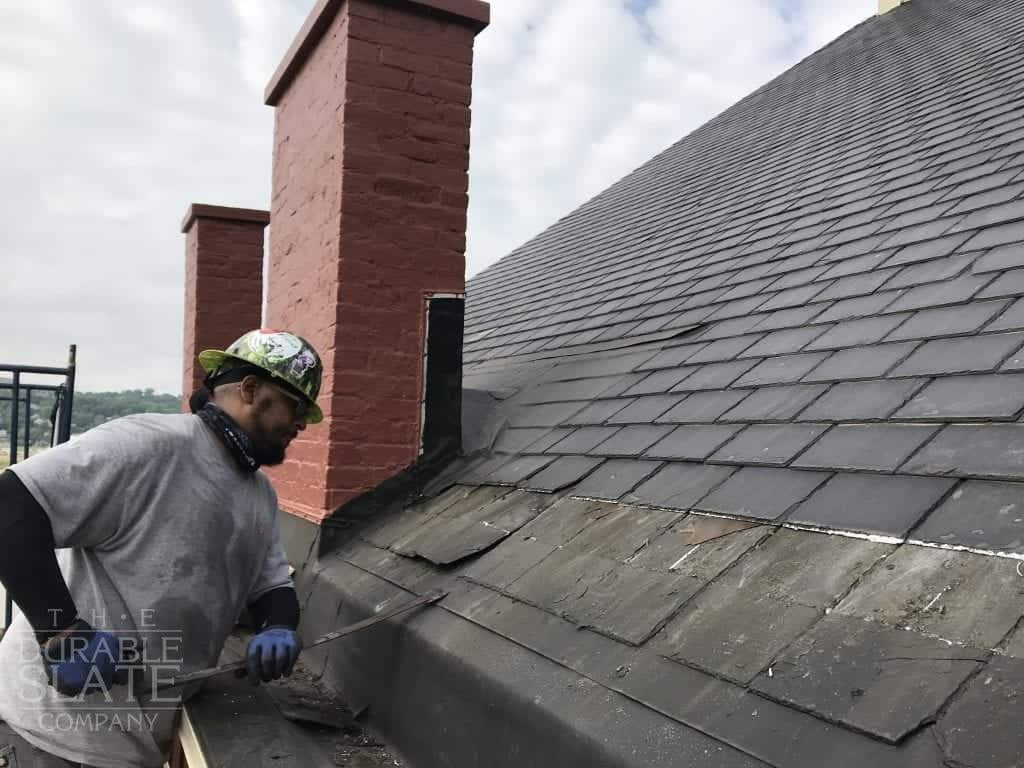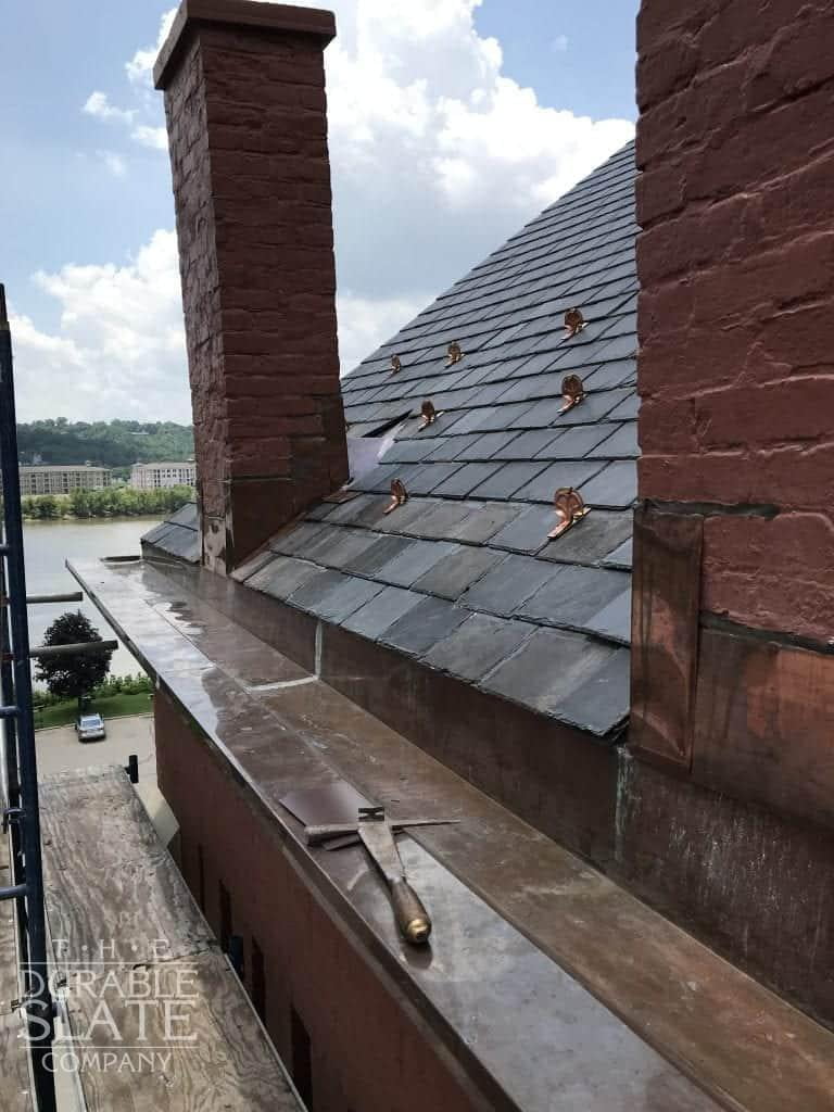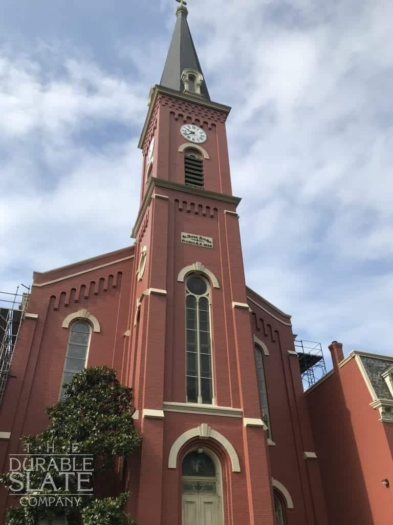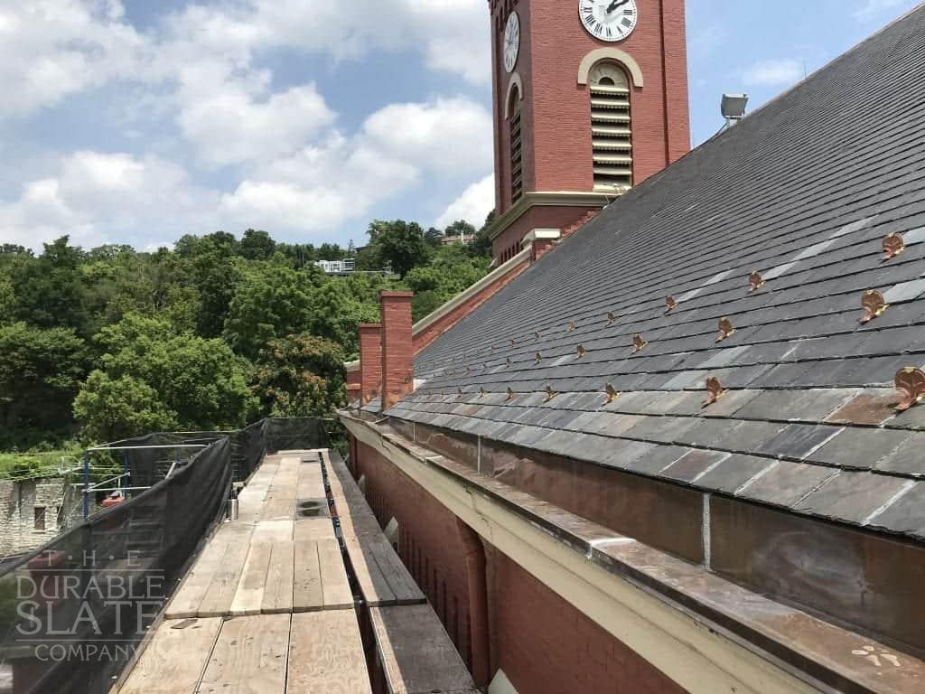 In 2019, we began our work at St. Rose of Lima. On this job, we repaired innumerable Buckingham slates across the main sanctuary roof. We also removed their existing gutter liners and fabricated and installed new hand soldered 20 oz. copper box gutter liners.