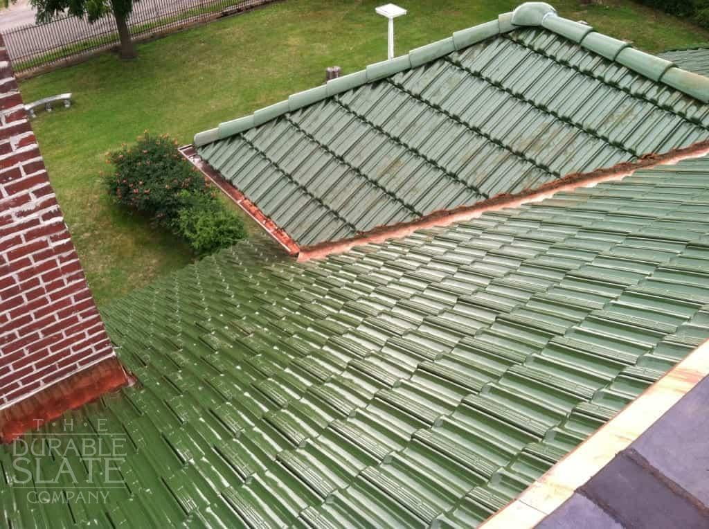 We installed a new clay-tile roof using La Escandella glazed green French tile from Alicante, Spain. Further, we matched the original clay tiles with new, fully custom copper flashings, gutters, and downspouts.