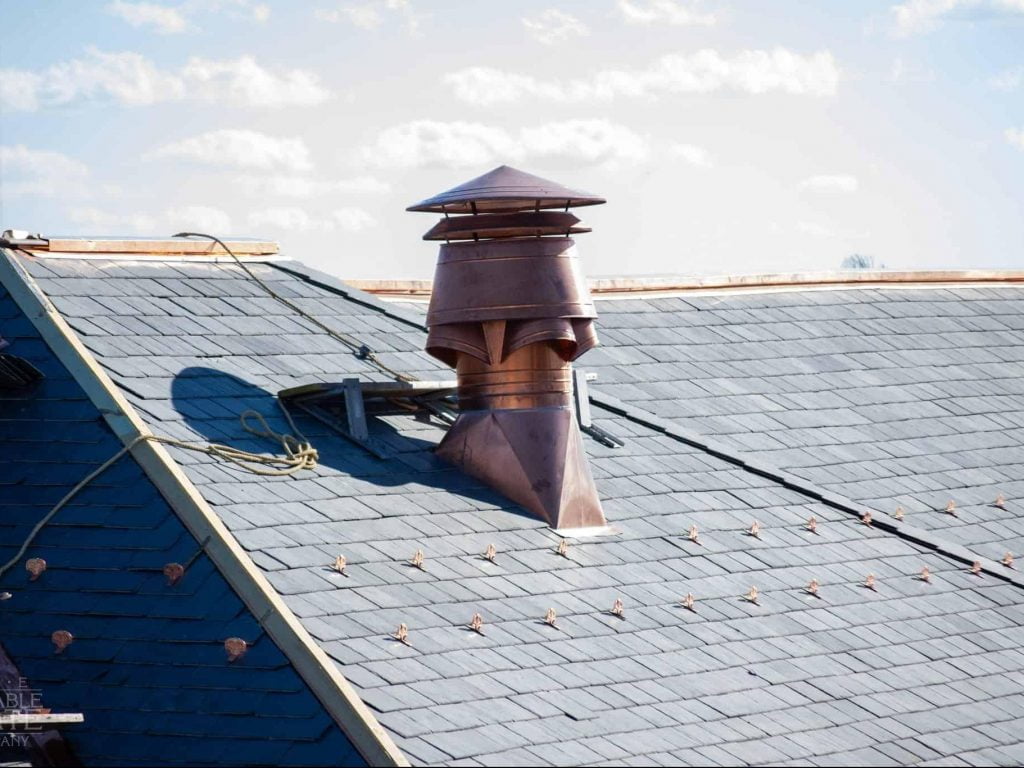 For Building #52, The Durable Slate Company removed the previous slate and installed a new, brilliant Riverstone slate roof, as well as new 20 oz copper box gutters, downspouts, and chimney vent pipe flashings. On the whole, a magnificent job for a historically significant building and campus.