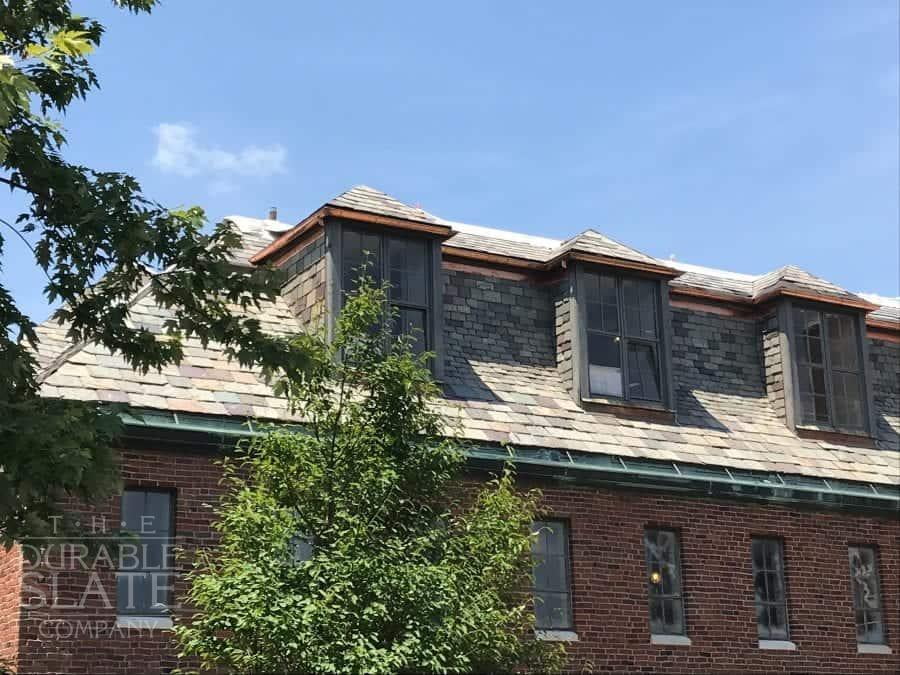 The total scope of work recently completed, after nearly a year onsite, included removal and reinstallation of the existing 1929 historical building’s slate roof, installing new underlayment, and new copper flashings. In addition to the installation of a new underlayment and replacing damaged slate, Durable Slate craftsmen fabricated and installed copper pieces on various flashings, aprons, selective gutters, downspouts and several eyebrow dormers for the 1929 building.